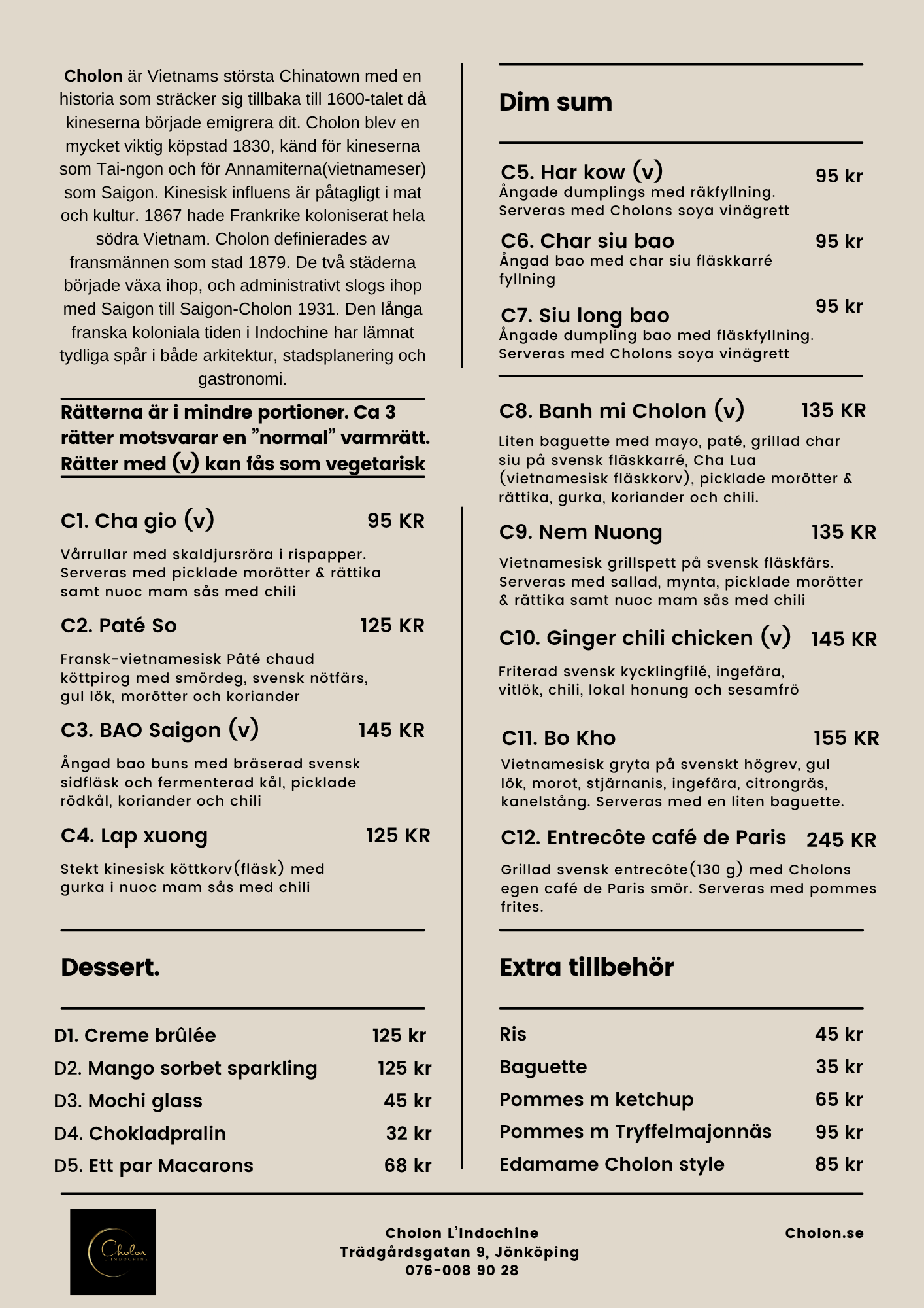 Cholon L’Indochine är mer än bara en restaurang och lounge – det är en portal till en försvunnen värld, där Sydvietnams pulserande Chinatown, fransk kolonial elegans och asiatisk handelsanda möts. På Cholon tar vi med dig på en resa genom detta kulturmöte. Här serveras vietnamesiska klassiker med kinesiska inslag, parfymen av fransk baguette och den doft av chili och citrongräs som fyllt Saigons gator i århundraden.
